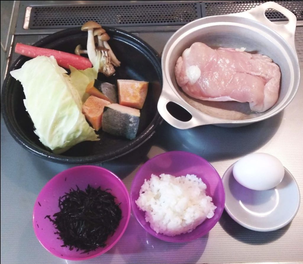 他の日だと、豆腐や白菜、椎茸、豆類、ワカメ、大根、トマト、ブロッコリー、チンゲンサイ、ほうれん草、小松菜、ナス、きゅうり、サツマイモ・・・などなど、少しはバランスも考えますが、重さを量る必要もなく、見た目の感じでいいのです。
